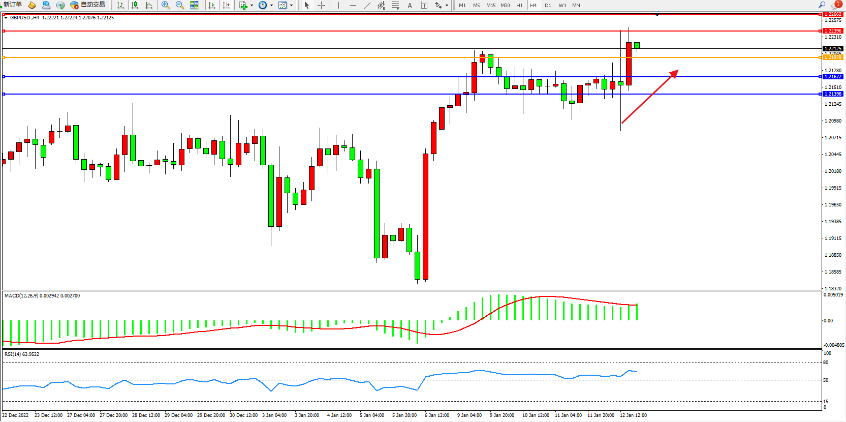 交易策略:1.21978上方看涨,目标1.22396、1.22662