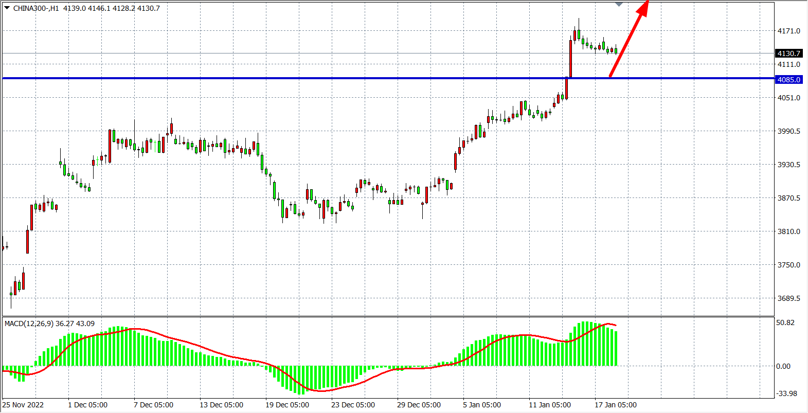 1小时图看,沪深300在4086之上运行呈高位盘整,但MACD量能在仍在零轴之上继续量能均匀放大状态,上行趋势未改,当前支撑继续关注4086附近,上方目标看4200-4250附近。