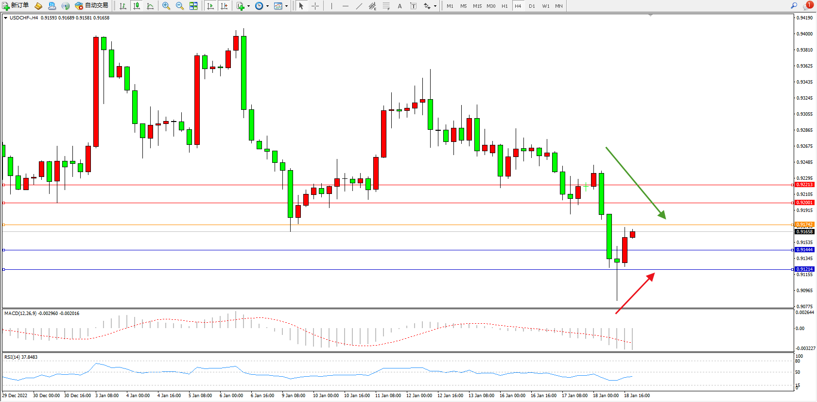交易策略:0.91742下方看跌,目标0.91444、0.91214