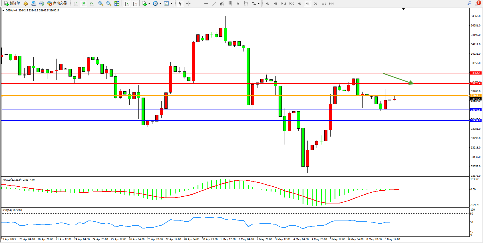 道琼斯指数DJ30——4小时K线图显示: