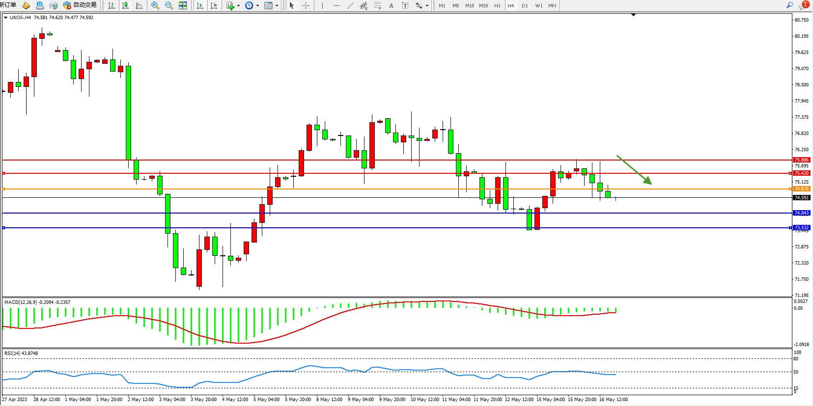 交易策略:74.876下方看跌,目标74.043 73.532