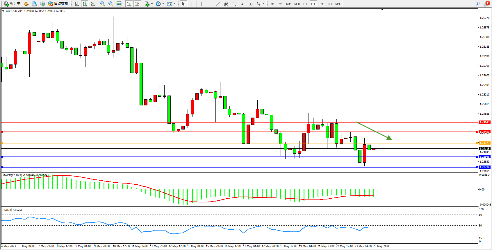 交易策略:1.24223下方看跌,目标1.23946  1.23734