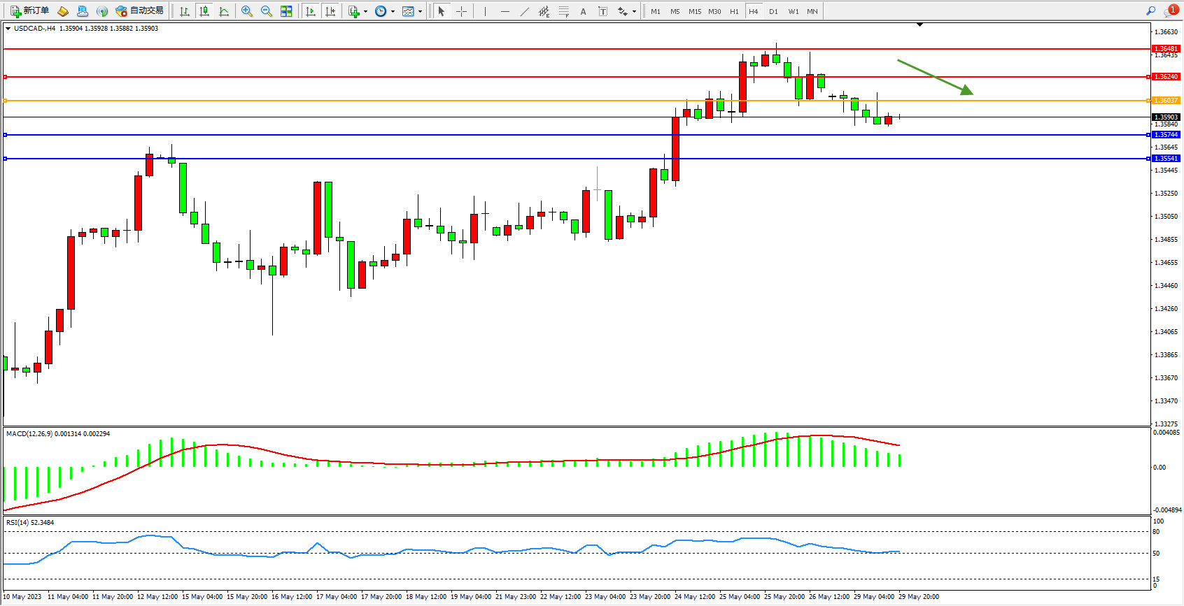 美元加元USDCAD——4小时K线图显示: