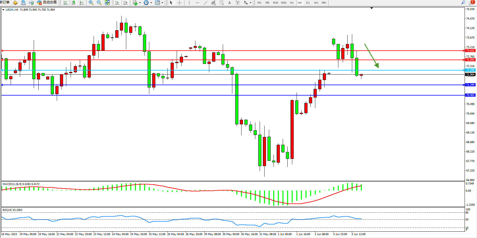 原油维持72.099附近震荡,国际油价一度大涨逾4%至5月初以来新高,全球最大出口国沙特阿拉伯承诺从7月起再减产100万桶/人,以抵消令市场低迷的宏观经济逆风。