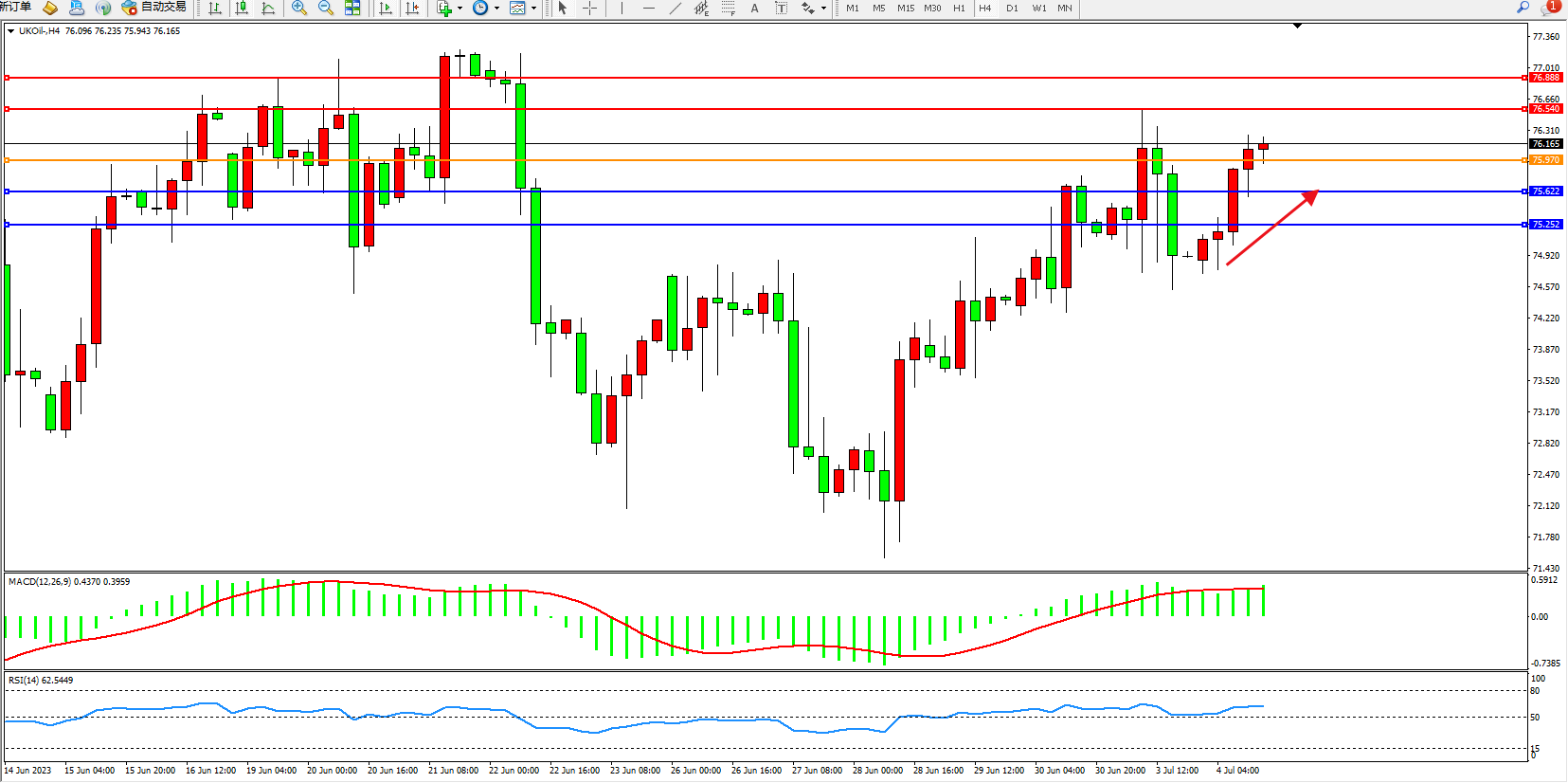 交易策略:75.970上方看涨,目标76.540  76.888
