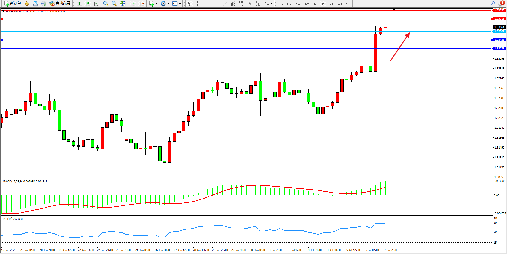 美元加元USDCAD——4小时K线图显示: