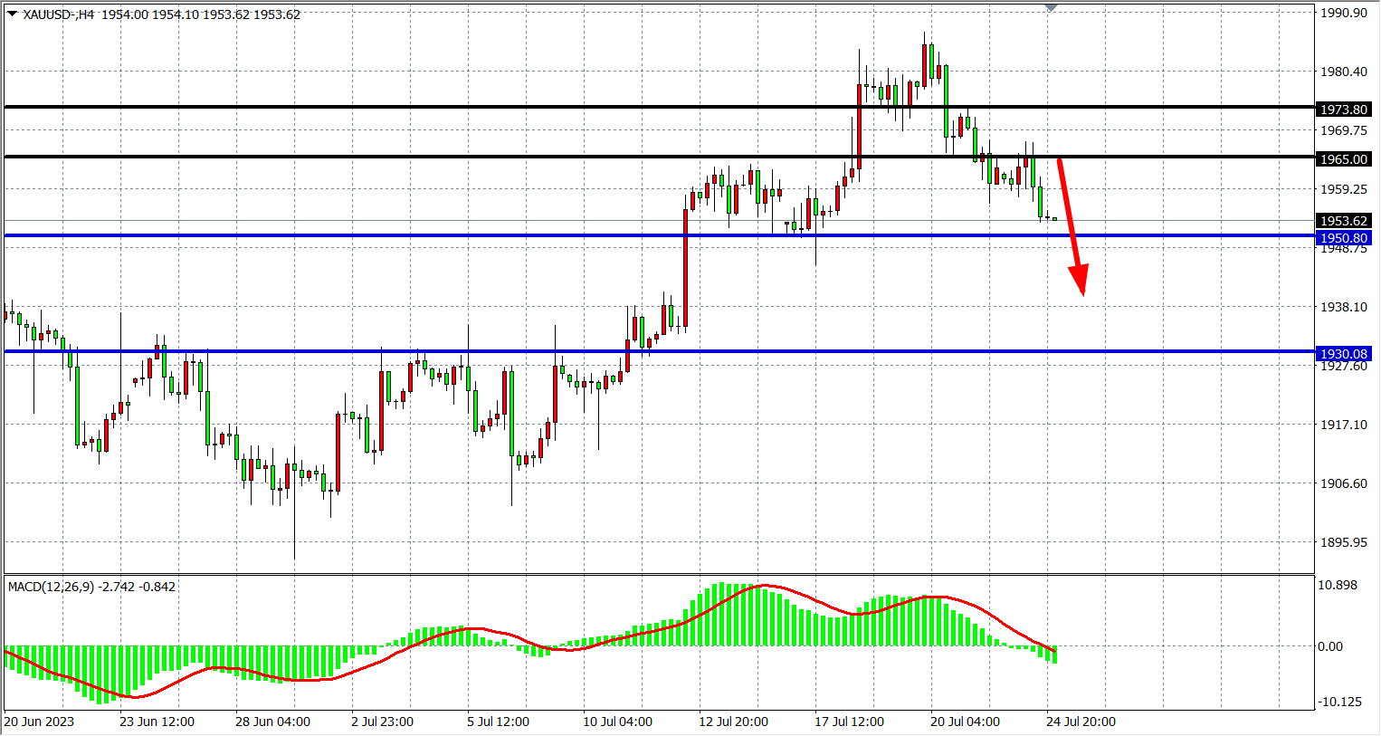 周一(7月24日)周一美国公布的经济数据好坏参半,制造业PMI表现强劲,服务业PMI则有所回落,跟综合PMI一道创5个月新低,另外,通胀粘性的担忧依然存在。现货黄金受制于美元指数和美债收益率反弹,失守1960关口,连续4个交易日下跌,抹去过去一周全部涨幅,收跌0.37%。