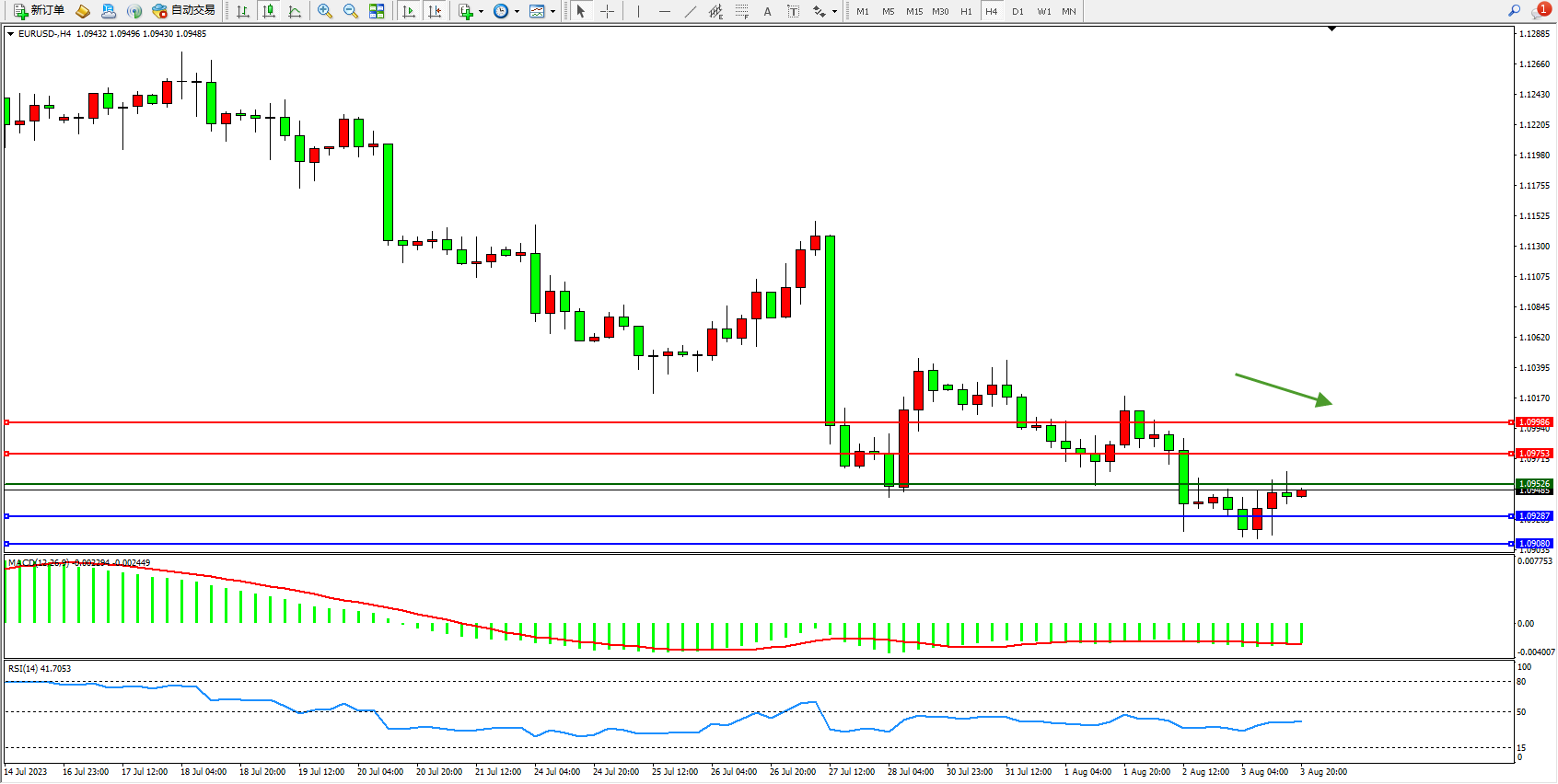 欧元美元EURUSD—4小时K线图显示: