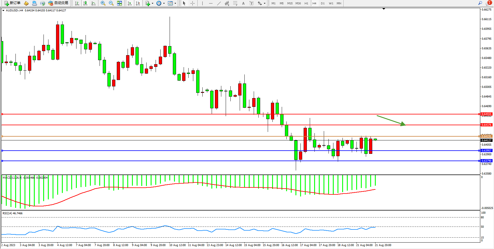 交易策略:0.64191下方看跌,目标0.63957 0.63790