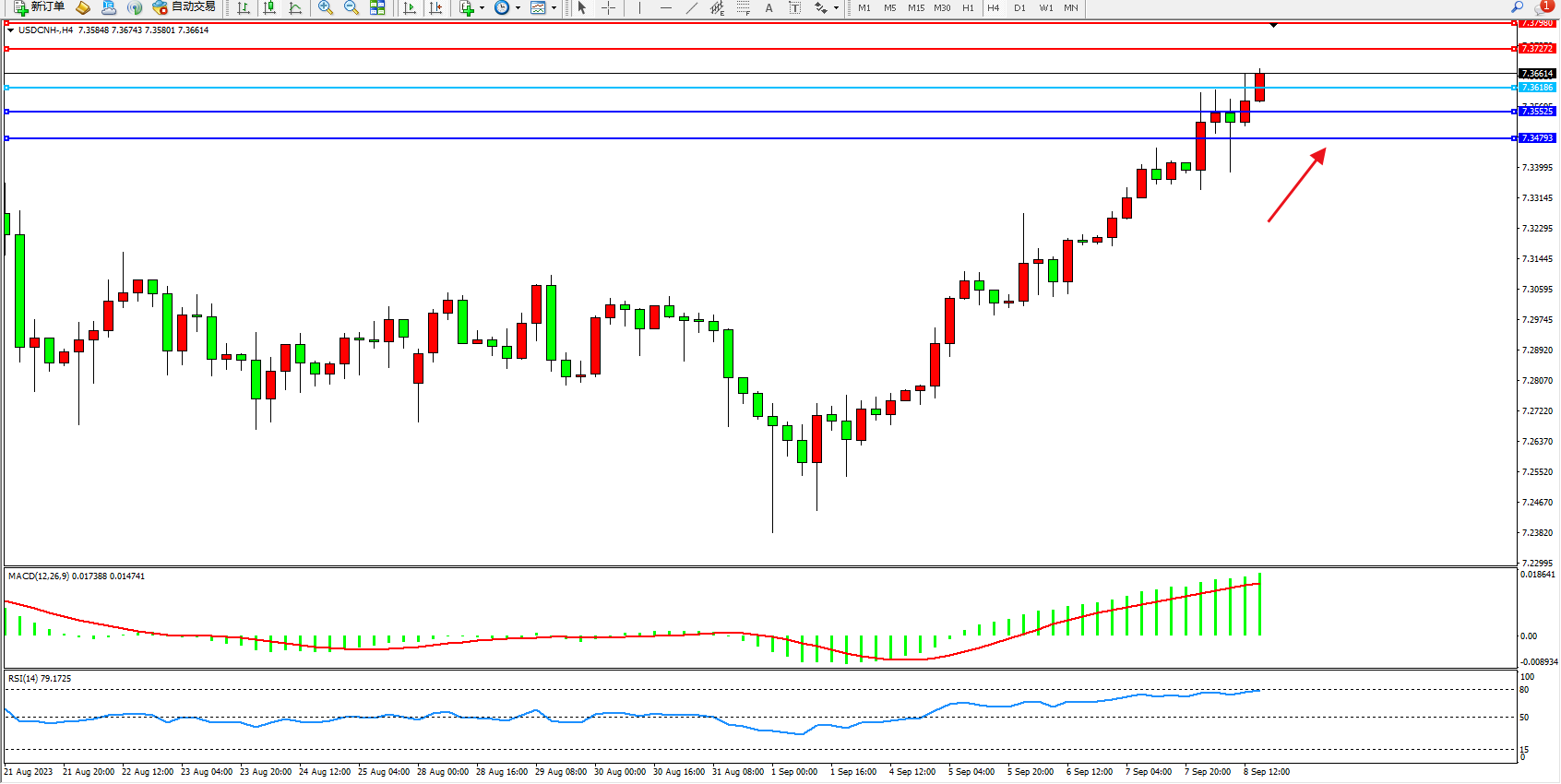 美元人民币USDCNH——4小时K线图显示: