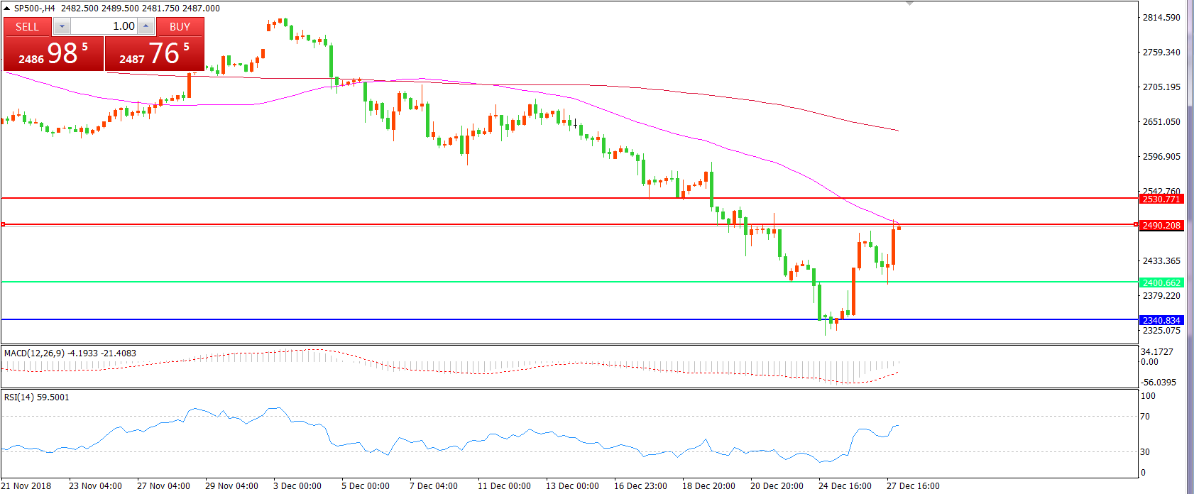 4小时图看,SP500触碰2340支撑后大幅反弹, MACD绿柱缩短,RSI指标出现拐头,短期震荡走势概率较大。