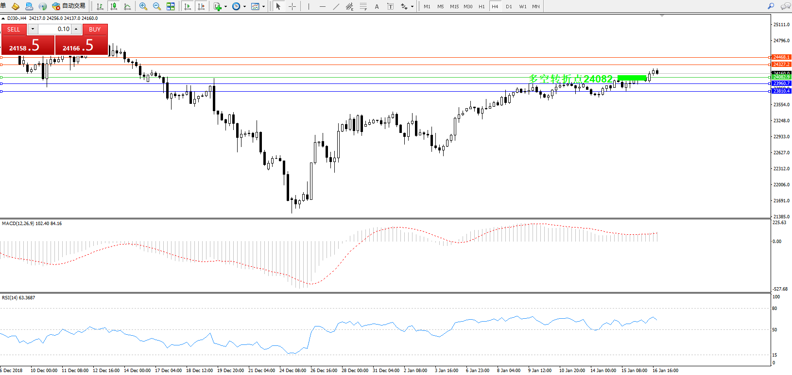 道琼斯指数DJ30—— 4小时K线图显示: