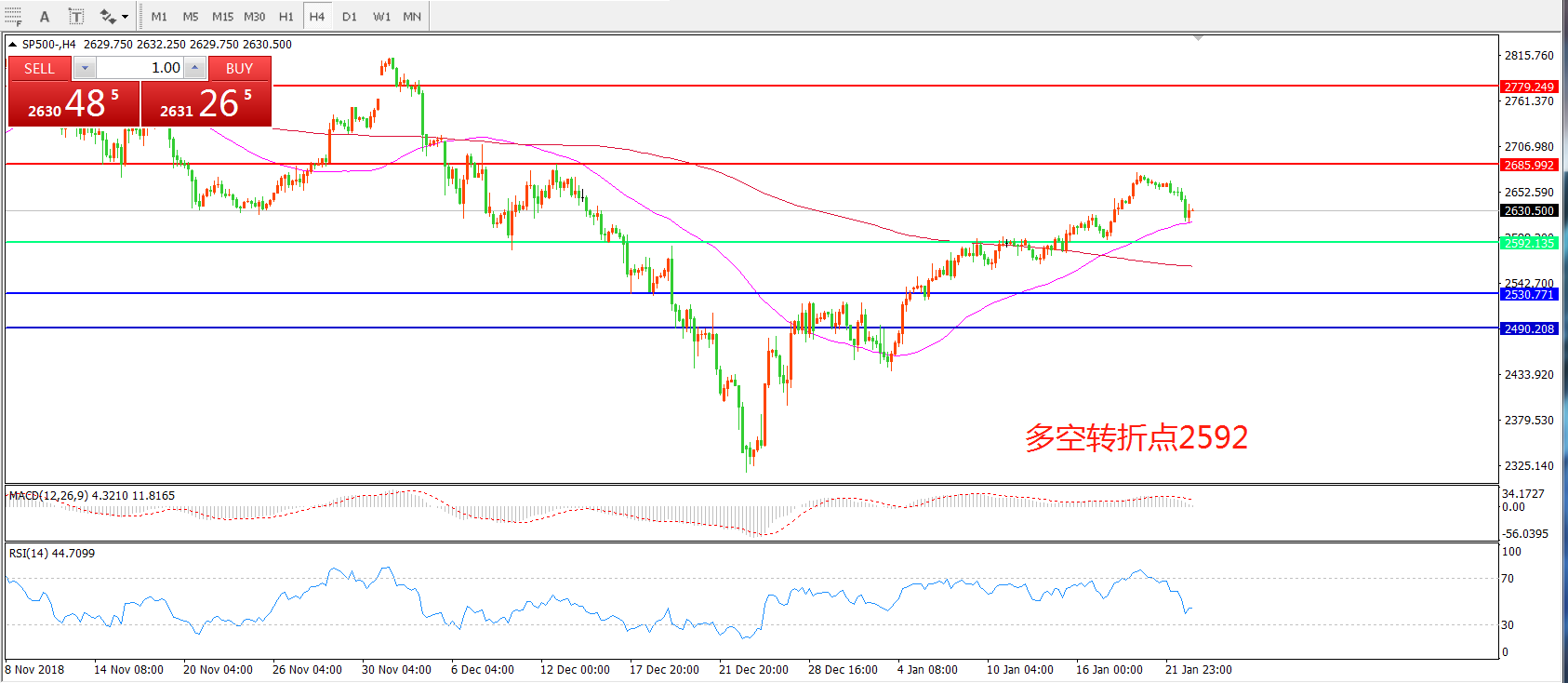 4小时图看,SP500近期逐渐站稳200周期均线,短期55均线有拐头上升迹象,MACD红柱缩短,小幅反弹成为可能。