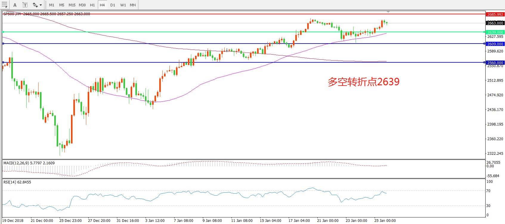 4小时图看,SP500近期逐渐站稳55周期均线,上升趋势明显,MACD红柱缩短,逢低做多是合理选择。
