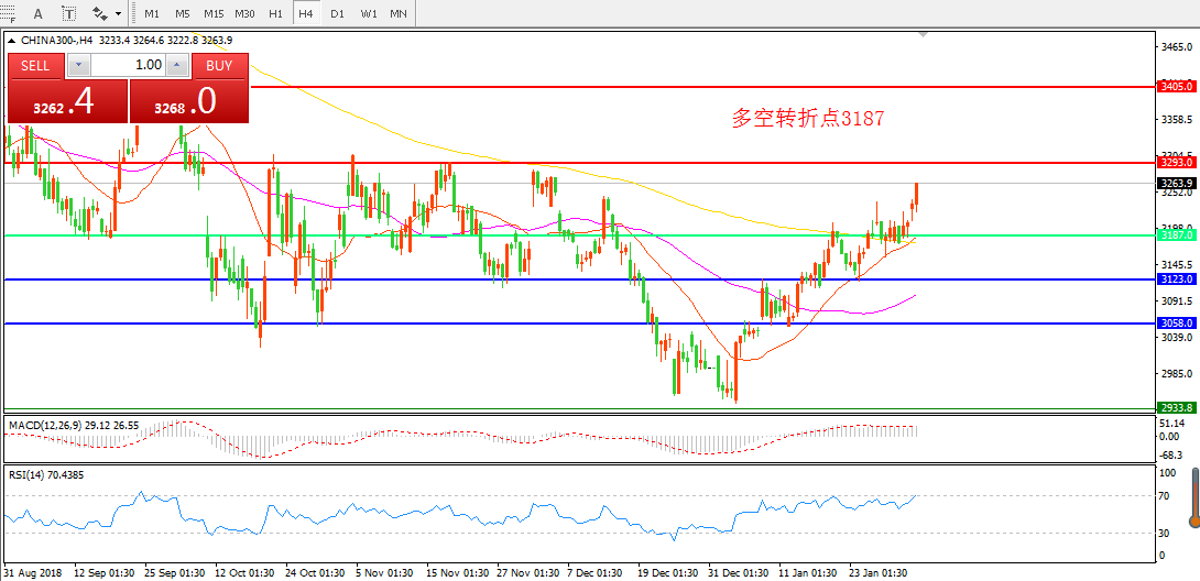 4小时图看,CHINA300中华指数21均线与200均线形成金叉后中阳上升,整体走势十分强势。 MACD红柱增加,保持偏多思路。