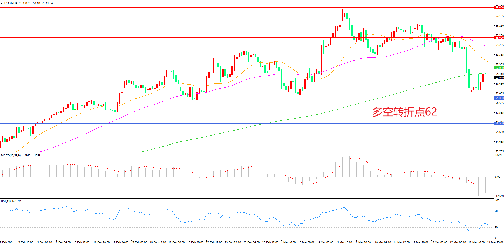 目前,去美国新一轮财政刺激计划出台和欧佩克+增产延后对油市的提振作用已基本被消化。因此,WTI原油要重回65美元关口,需要需求方面有进一步回暖的迹象,长期看来,随着世界各国广泛推进疫苗接种,欧洲主要国家恢复接种阿斯利康疫苗,全球经济增长前景有望带动原油需求继续复苏,从而使油价获得一定的支撑。