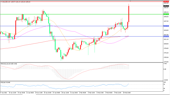 上周五(2月11日),美国总统拜登11日在与西方多个国家领导人召开的视频会议中称,俄罗斯“入侵”乌克兰的日期是2月16日,大量避险资金涌入黄金市场,金价长阳拉升,收报1858.88美元/盎司。