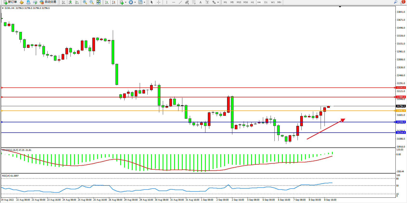 道琼斯指数DJ30——4小时K线图显示: