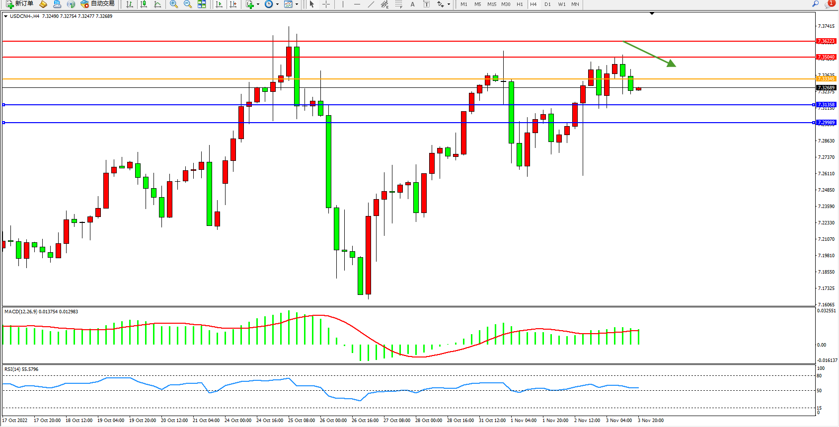 美元人民币USDCNH——4小时K线图显示: