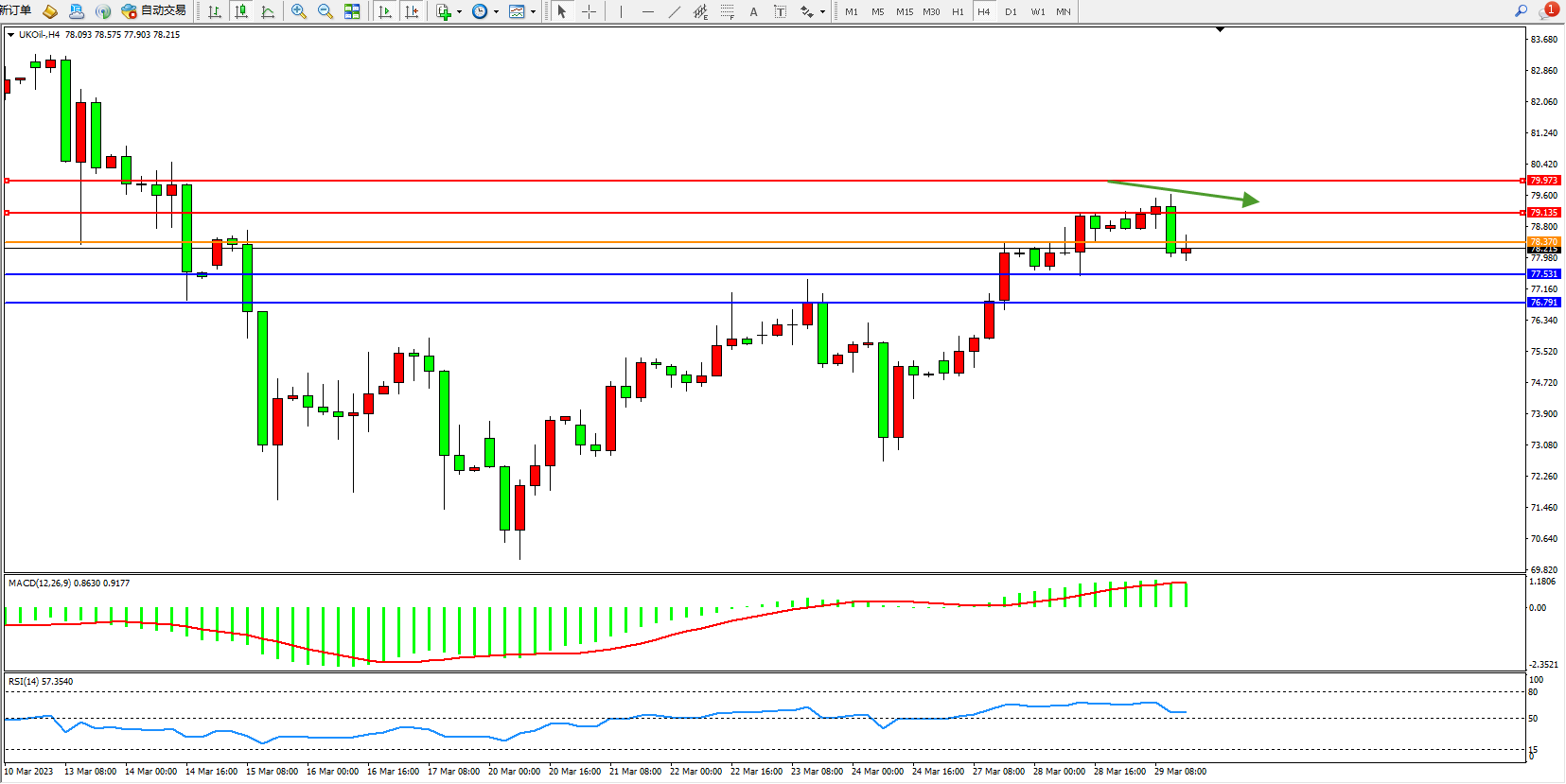 交易策略:78.370下方看跌,目标77.531  76.791