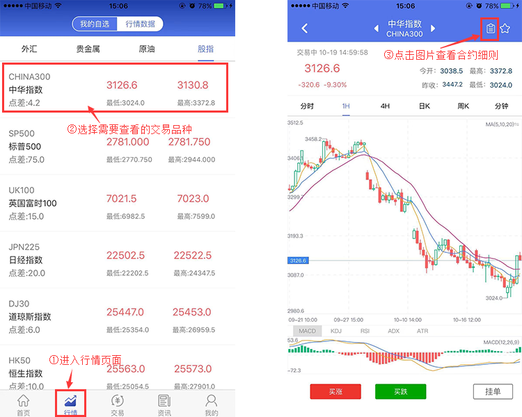 2.进入行情页面,选择交易品种进入对应品种行情页进行查看,如下图操作